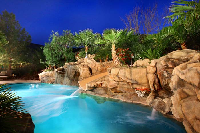 Just a few years old, we're still not used to the extraordinary pleasures of this aquatic oasis. The sights and sounds of the waterfalls take you completely out of the desert and into a tropical paradise. We have a blast cliff climbing and diving. The regulation basketball set-up is 1st class.